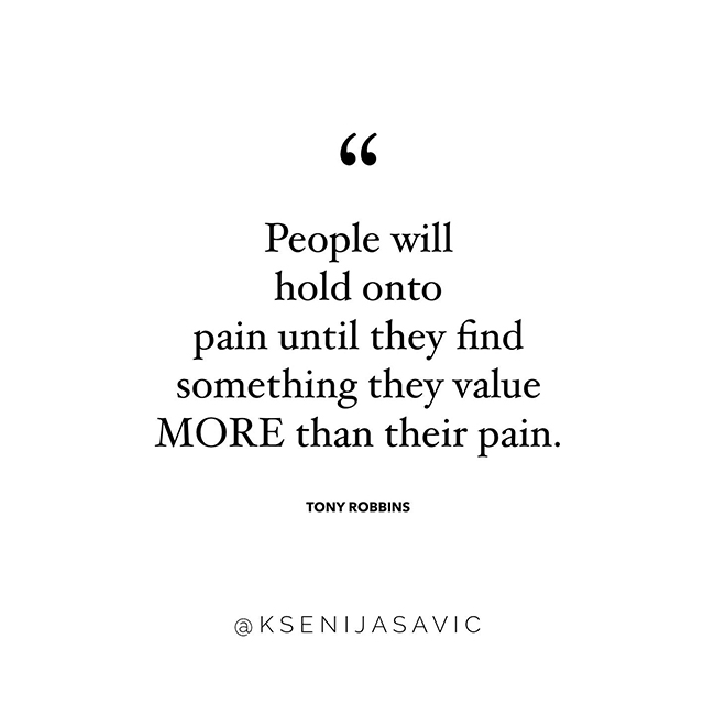 This quote struck me profoundly. It's interesting to think that the very thing that may be holding one back from _________ ( <<<------ fill in the blank of a goal you wish to achieve) is the pain you are giving more attention & value to (even when you don't realize it).
