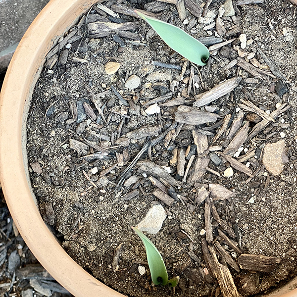 One early morning this past week, the tulip happened to pop into my mind again so I decided to peek over at the side of our porch where the pot has rested all year. MUCH to my surprise (yet again) not only had it budded, but there were TWO now. 😮 I just couldn’t believe it.