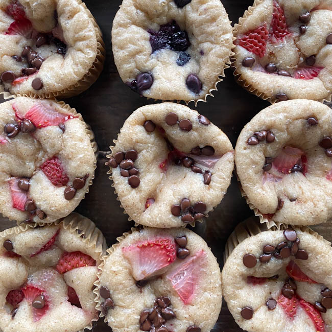 4. Add in the toppings of your choice! For this batch I did half with blueberries & the other half with strawberries plus mini chocolate chips.