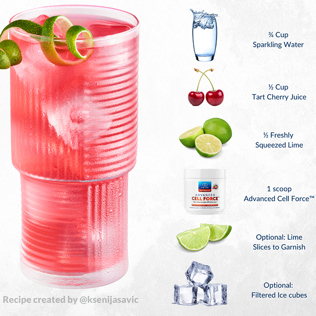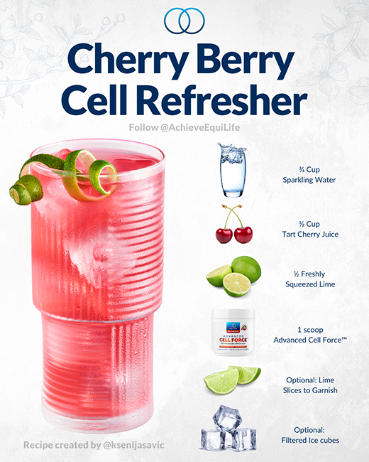 Meet what I like to call the “Cherry Berry Cell Refresher” 👉🏼 organic tart cherry juice, lime, sparkling water & a scoop of @AchieveEquilife's Advanced Cell Force™ for the ultimate sip that’s energizing, restorative, AND tastes so good to boot! 😍💛
