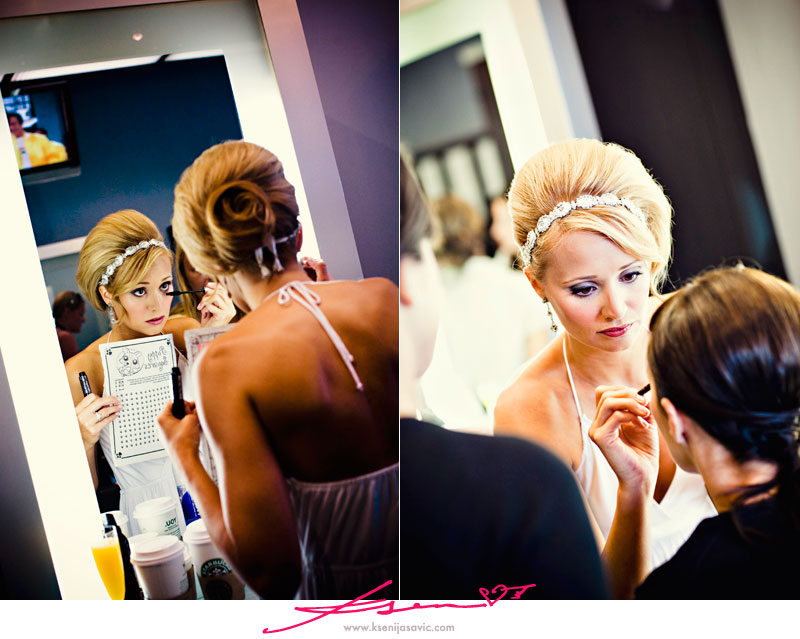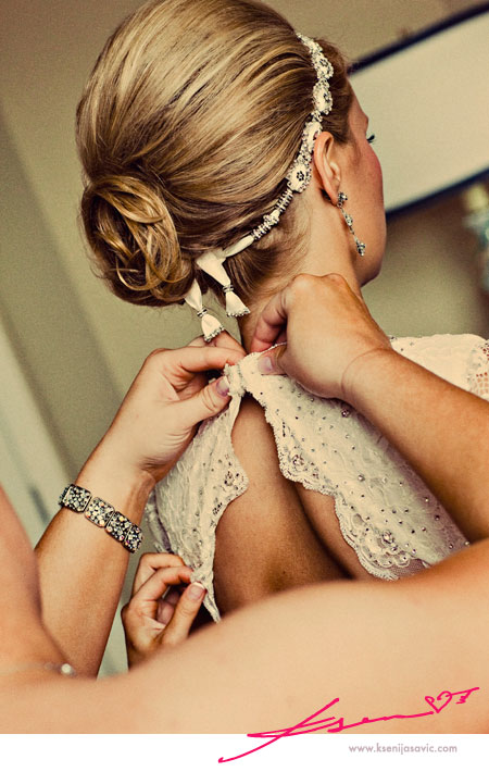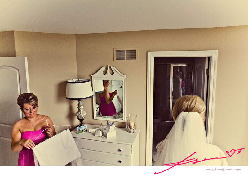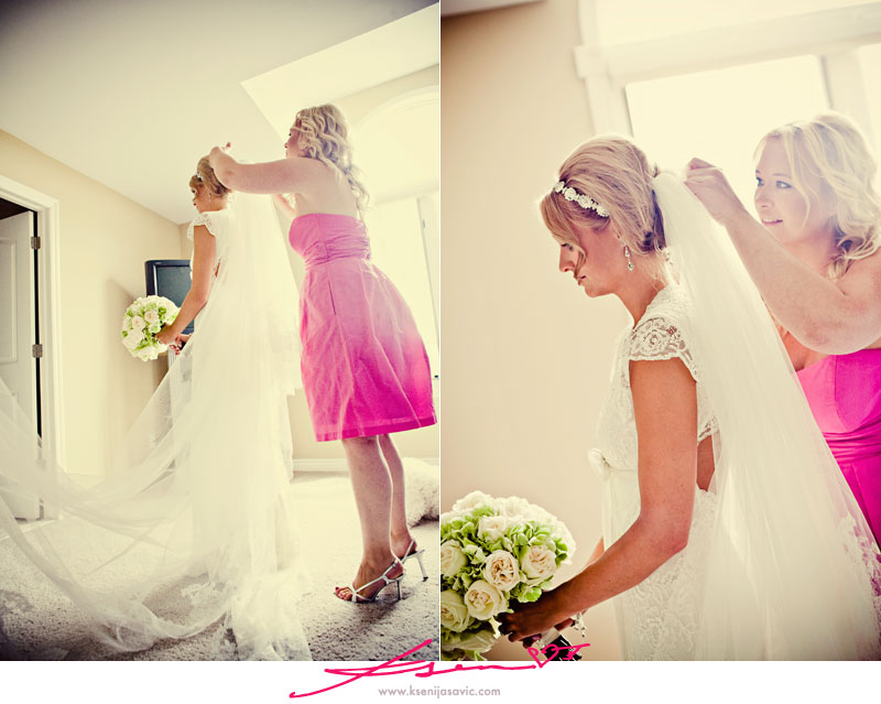 Heidi (her sister & Maid of Honor) adhering the veil :